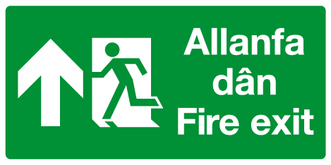 Allanfa dan Fire exit straight ahead left Welsh/English sign