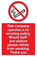 Here you will find a selection of 'No smoking', 'Do not smoke' 'Thank you for not smoking', 'Designated smoking area', 'strictly no smoking signs' and 'No smoking beyond this point or on the premises' signs available in various materials and various sizes.